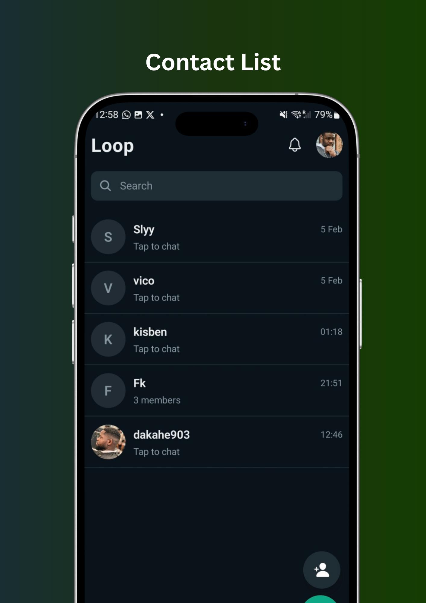 Loop is a private messaging app built for small circles, not open social feeds. Join with an invite, add contacts by username (with accept), then chat one-to-one or in groups. Share text, images, voice notes, and video with a dark, WhatsApp-style UI. Bullet-style (feature list) Invite-only access Direct and group chats Photos, voice messages, and video Contact requests (add by username, other side accepts) Read receipts and replies in conversation Profile with avatar
